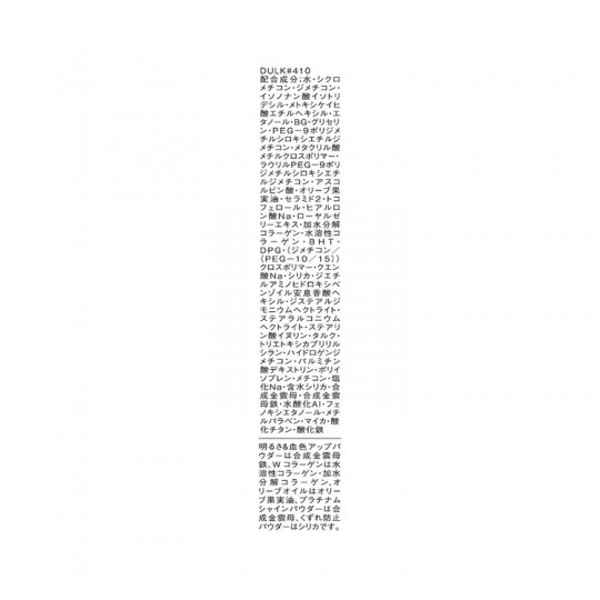 물,시크 로메 치콘,지메,이소 노난 산 이소 토리 데 시루 메시 케이 히 산 에틸 헥실 에탄올 BG 글리세린 PEG -9 폴리 디메틸 실록시 에틸 지메,메틸 메타 크릴 레이트 크로스 폴리머 라 우릴 PEG-9 폴리 디메틸 실록시 에틸 지메 아스 코르 빈산 올리브 열매 오일 세라 2 토코페롤 히알 론산 Na 로야 루 제리 가수 분해 콜라겐,수용성 콜라겐,BHT,DPG,(지메 치콘 / (PEG-10 / 15)) 크로스 폴리머,구연산 Na 실리카 디 에틸 아미노 하이드 록시 벤조일 안식향산 헥실,스테아 루지 모니 우무 헥토 라이트 스테 아라 루 코니 우무 헥토 라이트 스테아르 산이 린 탈크 트리에 톡시 카프리 릴 실란,하이드로 겐 지메,팔미트 산 덱스트린 폴리 이소프렌,치콘,염화 Na,수분 실리카 합성 금 운모 합성 금 운모 철 수산화 Al,페녹시 에탄올,메,운모,산화 티탄 산화철