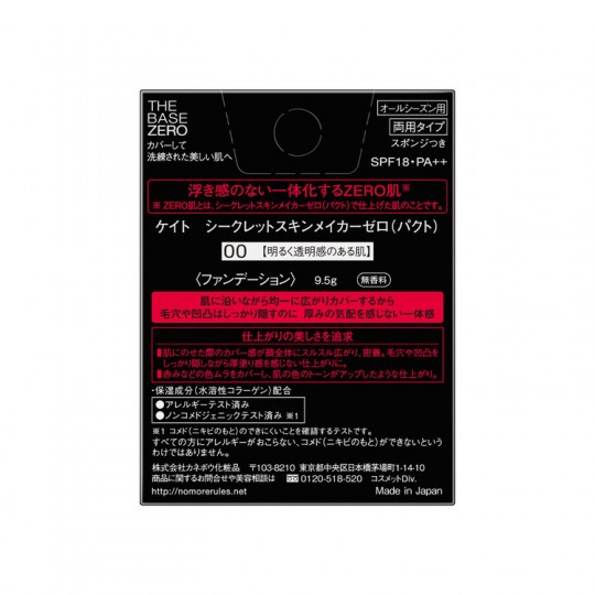 | 성분 | 성분 분량 <성분> 활석, 운모, 나일론 -12, 질화 붕소, 합성 플루오르 플 로고 파이 트 알루미나 (디 페닐 지메 / 비닐 페닐 지메 / 실 세스 퀴 옥산) 크로스 폴리머, 히드 록시 스테아린산 에틸, 메시 케이 히 산 에치, Dimethicone, 스쿠알렌, 이소 수소 첨가 피마자 기름, 토리, 이소 노난 산 이소 노닐, 바셀린, 지카 푸리 루 산 PG, 퍼플 루오로 옥틸 트리에 톡시 실란, 메 치콘, 수산화 Al, 수분 실리카 (Dimethicone / 메 치콘) 코 폴리머, 이소 스테 아릴 알코올, 수용성 콜라겐, 에틸 파라벤, 메틸 파라벤, 데 히도로 초산 Na, (+/-) 산화 티탄, 산화 아연, 산화철 용 및 용량 <사용 방법> ● 별매의 케이트 시크릿 스킨 메이커 제로 (팩트) 케이스에 넣고 사용하십시오. ○ 메이크업베이스로 피부를 정돈하고 나서 사용하십시오. ○ 스폰지에 적당량을 취해 얼굴 중심에서 바깥쪽으로 피부에 균일하게 펴주세요.