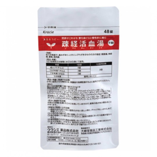 | 성분 | 성분 분량 성인 1 일 복용량 12 정 (1 정 353mg) 중 다음의 성분을 포함하고 있습니다. 疎経活血湯 추출물 분말 ... 3000mg (지황,당귀,본인,천궁,부쿠 료오,뱌쿠 쥬쯔 각 1.0g, 고시쯔,류우탄,찐삐 공갈,이레이센 보위,보우 후우 각 0.75g, 뱌 쿠시 감초 각 0.5g, 작약 1.25g, 쇼오 쿄오 0.25g보다 추출) 첨가제로, 활석, 스테아린산 Mg, CMC - Ca, CMC-Na, 이산화 규소, 폴리 옥시 에틸렌 폴리 옥시 프로필렌 글리콜, 히뿌로 메로스를 함유한다. <성분,분량 고려 본 물질은 천연물 (생약)의 추출물을 이용하고 있기 때문에, 정제의 색상이 다소 다를 수 있습니다. p> 용법 및 용량 다음 달 1 일 3 회 식전 또는 식간에 물 또는 백탕으로 복용. ○ 성인 (15 세 이상) ... 1 회 용량 4 정, 1 일 복용 횟수 3 회 ○ 15 세 미만 7 세 이상 ... 1 회 양 3 정, 1 일 복용 횟수 3 회 ○ 7 세 미만 5 세 이상 ... 1 회 용량 2 정, 1 일 복용 횟수 3 회 ○ 5 세 미만 ... 복용하지 않는 것이 용법 용량 고려 소아에 복용시킬 경우에는 보호자의지도 감독하에 복용시켜주십시오. p> 제형 형상 소 정 p> |