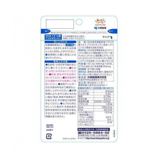 성분 원재료 명 DHA 함유 정제 어유, 은행잎 추출물, 아스 함유 Haematococcus 조류 추출 오일, 비타민 E, 글리세린 지방산 에스테르 ,, 밀랍, 식물성 유지, 사후 오일, 대두 레시틴 캡슐 피포 재 : 젤라틴, 글리세린, 피틴산 영양 성분 (3 마리) 당 에너지 9.4kcal, 단백질 0.4g, 지질 0.78g 당질 0.19g식이 섬유 0.016g 나트륨 0.036~1.4mg, 비타민 E 1.8mg, DHA 250mg, EPA 32mg, 은행잎 추출물 표준 함량으로 120mg (표준 함량으로 : 후라보노루 배합 체 24 %, 테르펜 락톤 류 6 %), 아스 (프리 체로) ... 2mg
