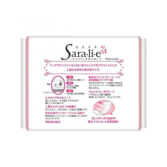 상품소개 사라사티 Saralie 내츄럴 린넨는 1일 깨끗이 정화,뮤게와 자스민 등 하얀꽃에 사향을 엑센트로 향기직물시트(팬티 라이너)입니다.눈가까지 부드러운 시트 채용으로 고급린넨과 같은 은근하고 부드럽고 편안한 촉감입니다.또한 공기를 통과, 소취 성분 배합.슬림 컷 모양입니다.