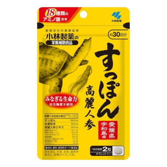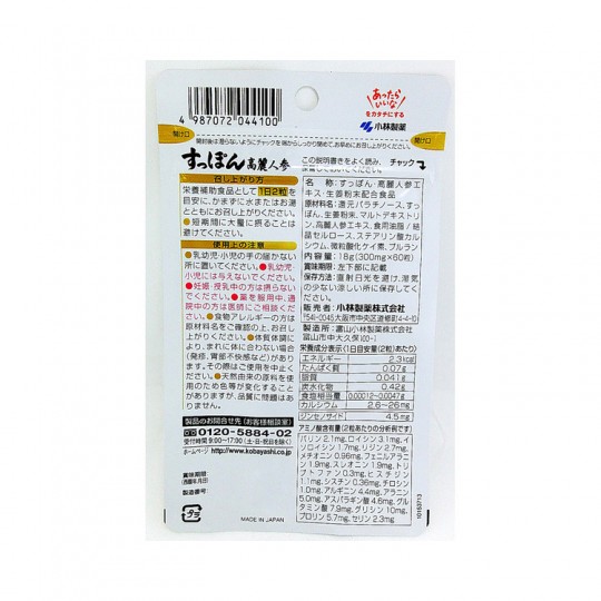 | 성분 | 원재료 명 환원 빠 라찌 노스, 자라, 생강 분말, 말토 덱스트린, 인삼 추출물, 식용 유지 / 결정 셀룰로오스, 스테아린산 칼슘, 미립 이산화 규소, 뿌루 란 영양 성분 표시 : 1 일 기준 금액 (2 마리) 당 에너지 : 2.3kcal, 단백질 : 0.07g, 지질 : 0.041g, 탄수화물 : 0.42g, 식염 상당량 : 0.00012-0.0047g 칼슘 : 2.6-26mg, 진 세노 사이드 : 4.5mg 아미노산 함량 (2 마리 당 분석 예입니다) 발린 : 2.1mg, 류신 : 3.1mg, 이소 류신 : 1.7mg, 리진 : 2.7mg, 메티오닌 : 0.96mg, 페닐알라닌 : 1.9mg, 트레오닌 : 1.9mg 트립토판 : 0.3mg, 히스티딘 : 1.1mg 시스틴 : 0.36mg, 티로신 : 1.0mg, 아르기닌 : 4.4mg, 알라닌 : 5.0mg, 아스파르트 산 : 4.6mg, 글루타민산 : 7.9mg, 글리신 : 10mg, 프롤린 : 5.7mg, 세린 : 2.3mg 제조시 1 일 기준량 당 함량 자라 : 100.0mg 생강 분말 : 50.0mg, 인삼 추출물 : 23.5mg, 결정 셀룰로오스 : 227.1mg 환원 파라치 노스 : 126.0mg, 말토 덱스트린 : 32.8mg, 식용 유지 : 22.8mg, 스테아린산 칼슘 : 11.2mg, 미립 이산화 규소 : 6.0mg , 뿌루 란 : 0.6mg