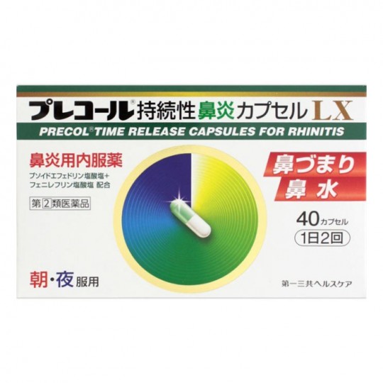 | 성분 | 성분 분량 이 약은 연한 녹색과 흰색의 캡슐 4 캡슐 중 다음의 성분을 함유하고 있습니다. 슈도에페드린 염산염 120mg (코 점막의 충혈이나 부은을 억제 코 막힘을 개선합니다.) 훼 니레 후린 염산염 10mg (코 점막의 충혈이나 맑음를 억제 코 막힘을 개선합니다.) 클로르 페니라민 말레 산염 ... 8mg (알레르기 증상 (코 막힘, 콧물, 재채기, 눈물 번째)을 억제합니다.) 벨라 총 알칼로이드 ··0.4mg (분비 억제 작용에 의해 콧물이나 눈물 자국을 억제합니다.) 그리 치르 리 틴산 ... 45mg (염증을 억제, 비염의 증상을 완화 하다합니다.) 무수 카페인 ... 100mg (비염에 따른 두중을 완화합니다.) 첨가물 : 옥수수 전분, 유당, 셀룰로오스, 히드 록시 프로필 셀룰로오스, 카루 메로스 Ca, 셀룰로오스, 글리세린 지방산 에스테르, 활석 청색 1 호, 젤라틴, 라 우릴 황산 Na p> 용법 및 용량 <용법 용량> 다음의 양을, 물 또는 따뜻한 물로 복용하십시오. 성인 (15 세 이상) ... 1 회 용량 2 캡슐, 1 일 복용 횟수 2 회 (아침 저녁) 7 세 이상 15 세 미만,·,1 회량 1 캡슐, 1 일 복용 횟수 2 회 (아침 저녁) 7 세 미만 ... 복용하지 마십시오. 용법 용량 고려 (1) 용법 용량을 준수하십시오. (2) 7 세 이상의 소아에 복용시킬 경우에는 보호자의지도 감독하에 복용시켜주십시오. (3) 캡슐 꺼내는 방법 오른쪽 그림과 같이 캡슐이 들어있는 PTP 시트의 볼록한 부분을 손가락으로 강하게 눌러 뒷면의 알루미늄 호일을 깨고 꺼내 복용하십시오. (잘못 그대로 삼키면 식도 점막에 꽂히는 등 뜻밖의 사고로 이어집니다) p> 제형 형상 하드 캡슐 제 p> |