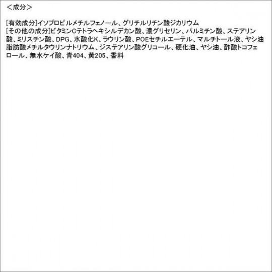 <유효 성분> 이소 프로필 메틸 페놀, 루리 산 지 카리 우무 <기타 성분> 비타민 C 테 토라 헤키 시루 산, 글리세린, 팔 미트 산, 스테아르 산, 미리 스틴 산, DPG, 수산화 K, lauric, POE 세틸 에테르, 말티톨 액, 야자유 지방산 메틸 타우린 나트륨, 지 스테아린 산 글리콜, 경화 오일, 코코넛 오일, 초산 토코페롤 , 실리카, 파랑 404, 노랑 205, 향료 용법 및 용량 <사용 방법> 손바닥에 적당량 (약 2cm)을 취하고 물 또는 미지근한 물로 잘 채찍부터 세척 후 충분히 헹구어주십시오.  제형 형상 크림