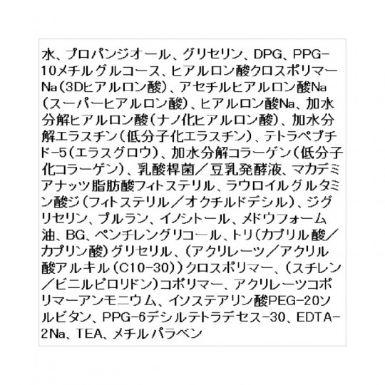 성분 성분 물, 프로판 디올, 글리세린, DPG, PPG-10 메틸 글루코스, 히알루 론산 크로스 폴리머 Na (3D 히알루 론산), 아세틸 히알루 론산 Na (슈퍼 히알루 론산), 히알루 론산 Na, 가수 분해 히알루 론산 (나노화 히알루 산), 가수 분해 엘라스틴 (저분자 화 엘라스틴), 테트라 펩타이드 -5 (에라스구로우), 가수 분해 콜라겐 (저분자 화 콜라겐), 유산균 / 두유 발효액, 마카다 미아 지방산 휘 토스 테리 루, 라우로 이루 구루 타민 산 지 (피트 스테 릴 / 옥틸 도데 실 ), 디 글리세린, 뿌루 란, 이노시톨, 메도우 폼 오일, BG, 펜치 렌 글리콜, 트리 (카 프릴 산 / 카 프린 산) 글리세 릴 (아쿠 리 레쯔 / 아크릴산 알킬 (C10-30)) 크로스 폴리머 (스티렌 / 비닐 피 롤리 돈) 코 폴리머, 아쿠 리레 쯔코 폴리머 암모늄, 이소 스테아린 산 PEG-20 소르 비탄, PPG-6 데실 테트라 데 세스 -30, EDTA-2Na, TEA, 메