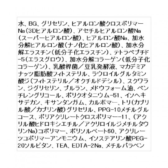 | 성분 | 성분 물, BG, 글리세린, 히알루 론산 크로스 폴리머 Na (3D 히알루 론산), 아세틸 히알루 론산 Na (슈퍼 히알루 론산), 히알루 론산 Na, 가수 분해 히알루 론산 (나노화 히알루 론산), 가수 분해 엘라스틴 (저분자 화 엘라스틴), 테트라 펩타이드 -5 (에라스구로우), 가수 분해 콜라겐 (저분자 화 콜라겐), 유산균 / 두유 발효액, 마카다 미아 지방산 휘 토스 테리 루, 라우로 이루 구루 타민 산 지 (피트 스테 릴 / 옥틸 도데 실), 스쿠알렌, 디 글리세린, 뿌루 란, 메도우 폼 오일, 펜치 렌 글리콜, 폴리 쿼터 늄 -51, 이소 헥사 데칸, 산탄 검, 카보 머, 트리 (카 프릴 산 / 카 프린 산) 글리세 릴, PPG-10 메틸 글루코오스, 폴리 아크릴 레이트 크로스 폴리머 -11 (아크릴 산 히드 록시 에틸 / 아쿠 Na) 코 폴리머, 폴리 소르 베이트 60, 아쿠 리레 쯔코 폴리머 암모늄, 이소 스테아린 산 PEG-20 소르 비탄, TEA, EDTA-2Na, 메 |