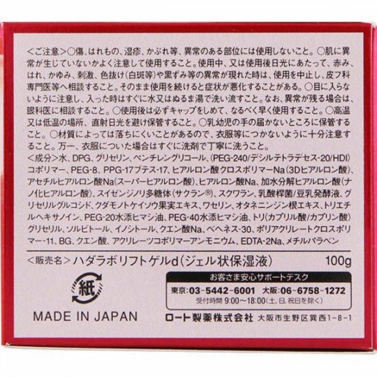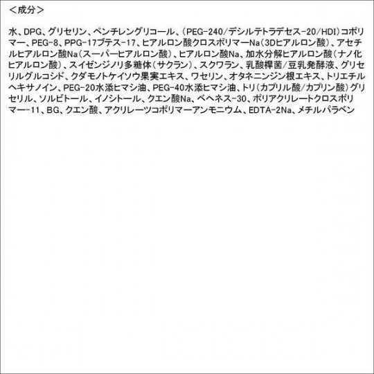 | 성분 | 성분분량 [재료] 물, DPG, 글리세린, 펜치 렌 글리콜 (PEG-240 / 데실 테트라 데 세스 -20 / HDI ) 코 폴리머, PEG-8, PPG - 17 부 테스 -17, 히알루 론산 크로스 폴리머 Na (3D 히알루 론산), 아세틸 히알루 론산 Na (슈퍼 히알루 론산), 히알루 론산 Na, 가수 분해 히알루 론산 (나노화 히알루 론산) 스이젠지노리 다당체 (착란), 스쿠알렌, 유산균 / 두유 발효액, 글리세 구루 코시 쿠다 모노 꽃시계 덩굴 열매 추출물, 바셀린, 인삼 뿌리 추출물, 토리, PEG-20 수소 첨가 피마자 기름, PEG-40 수소 첨가 피마자 기름, 새 (카 프릴 산 / 카 프린 산) 글리세 릴, 소르비톨, 이노시톨, 구연산 N , 베헤네스 -30, 폴리 아크릴 레이트 크로스 폴리머 -11 BG, 구연산, 아쿠 리레 쯔코 폴리머 암모늄, EDTA-2Na, 메 용법 및 용량 [사용 방법]●아침 저녁 세안 후 적당량을 취해 피부에 부드럽게 펴주세요. ●페이스 라인을 따라 손바닥 전체로 아래에서 위로 끌어 올리도록 바르는 것을 추천합니다. ●크림이나 팩 효과도 느낄 수있는 농후 한 사용감의 제제이기 때문에 메이크업을 할 때는 티슈로 억제하거나 시간을 기다렸다가 메이크업하는 것을 추천합니다. ●개폐 후 용기를 기울이면 유출 될 수 있으므로주의하시기 바랍니다. 제형 형상 젤 |