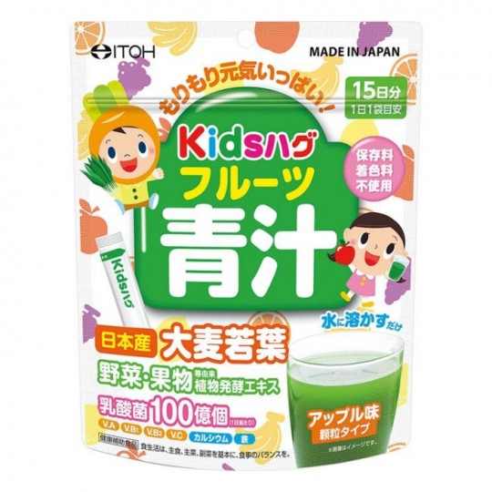 보리 새잎 말 (국내 제조), 포도당, 식물 발효 추출물 (바나나,오렌지,콩,참깨,호두 포함), 사과 농축 과즙 분말, 유산균 말 탄산 Ca, 향료, 산미료, V. C, 감미료 (아스파탐 L- 페닐알라닌 화합물, 스테비아, 수크랄로스), 피로 인산 철, V. B2, V. B1, V. A